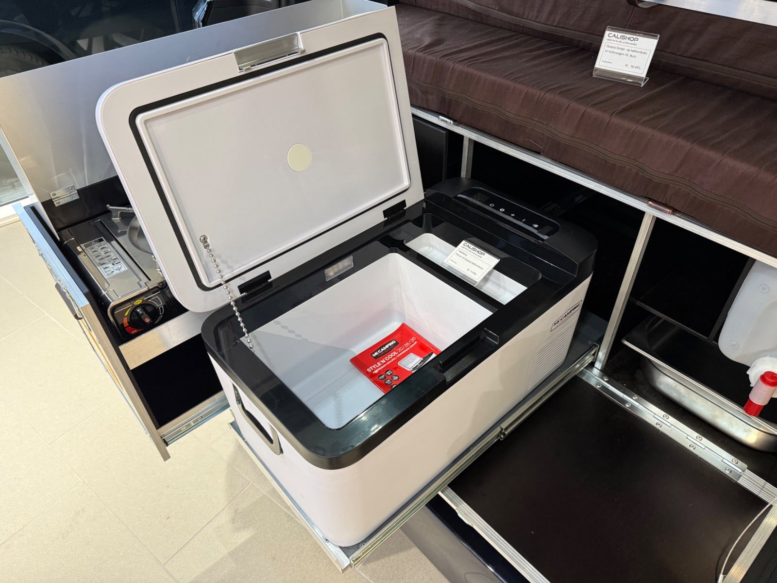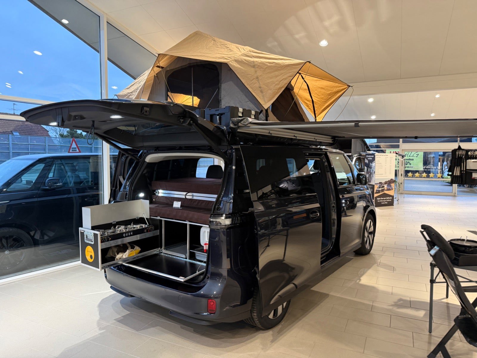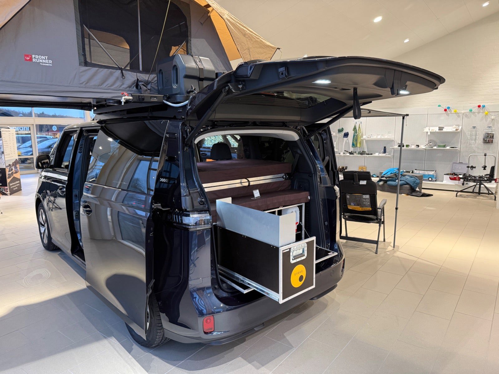 Calishop drejesokler på forsæderne - 11.000 kr. Campingboks med køkken til Buzz - 30.495 kr. Kompressor køleskab til camping boks - 2.036 kr. Tagbagagebærer LWB - 11.380 kr. Front Runner tagtelt til ID.Buzz - 9.420 kr. Monteringssæt: Quick release tagtelt - 1.060 kr. Vindskærm til Front Runner tagbagegebærer - 1.320 kr. Monteringssæt til markise - 930 kr. Wolf Pack Pro kasse 2 stk - 920 kr. Wolf Pack Pro monteringsbeslag 2 stk - 1.080 kr. Vandtank 42 liter med beslag - 1.560 kr. Tap udvidelsesbeslag til vandtank - 620 kr. Front Runner Markise 2,5 meter - 3.260 kr.